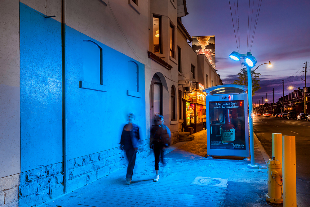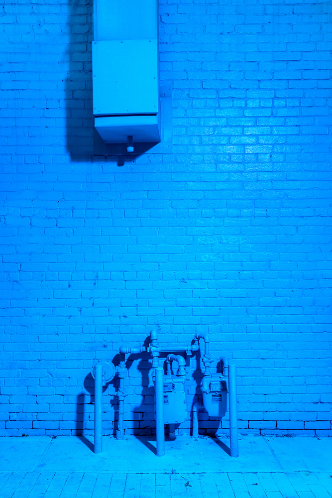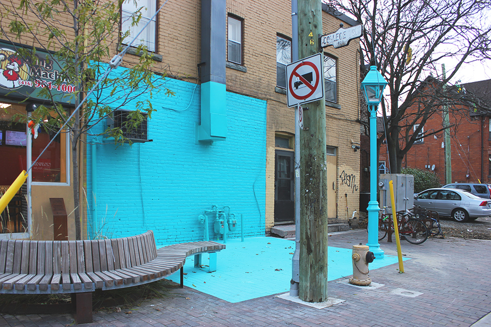 The Blue Room installation at the Roxton Road Parkette by day. The colour unifies disparate elements and textures into a cohesive spatial whole, altering our register of context and it material composition.The Blue Room installation at the Roxton Road Parkette at night with the colour matched lighting on. The soft glow of the blue space is at once integrated into yet distinguished from the context.Detail image from within the Blue room installation at the Roxton Road Parkette at night. The colour matched material finish and lighting create an effect of soft impalpable surfaces, edges and volume. A dreamlike space within the city but separate from it.Detail image of the Blue Room installation at Ossington Avenue by day. Layering of components, textures and conditions unified to each other and distinguished from the wider context.